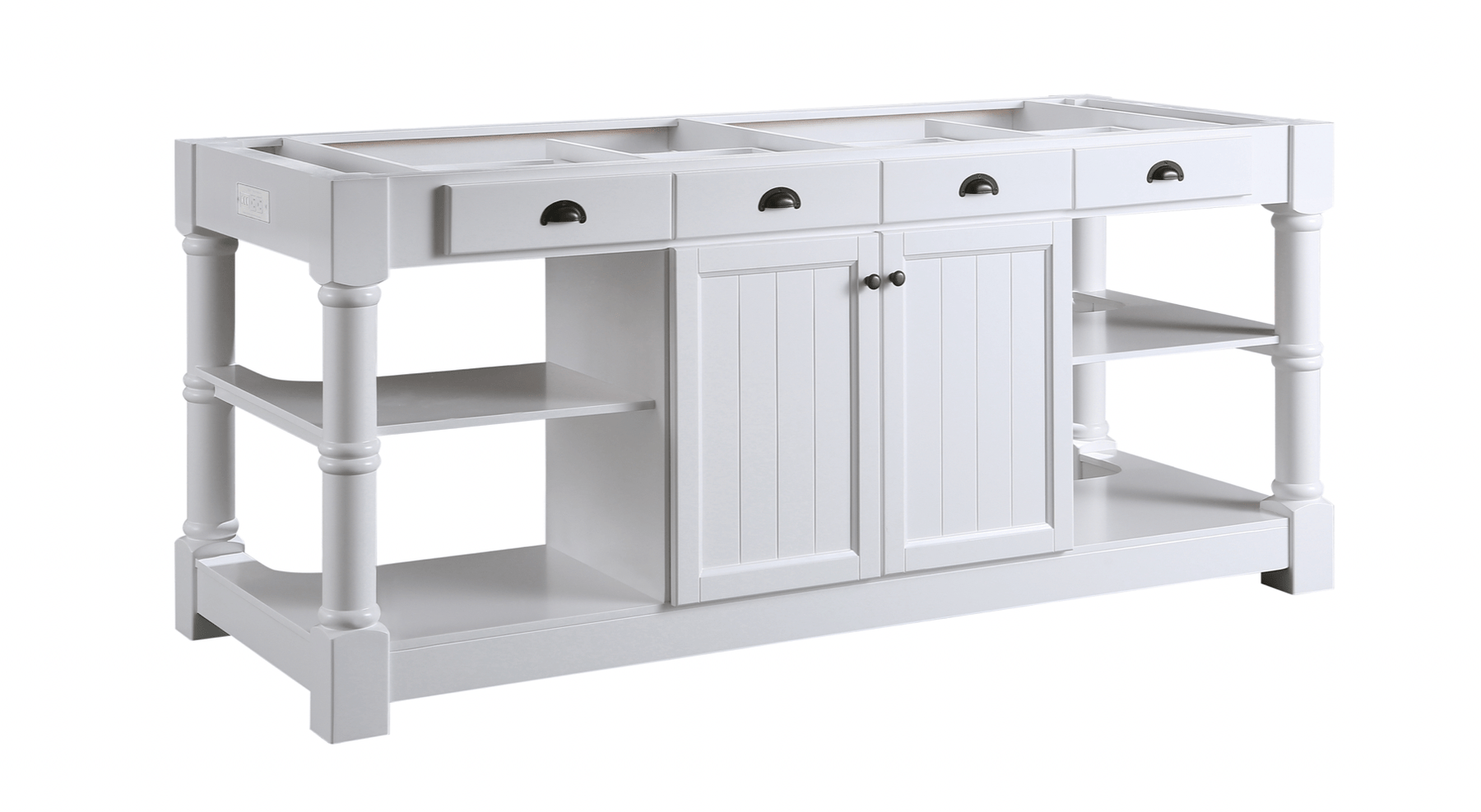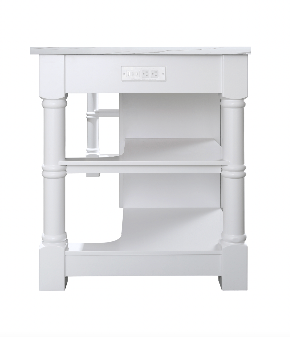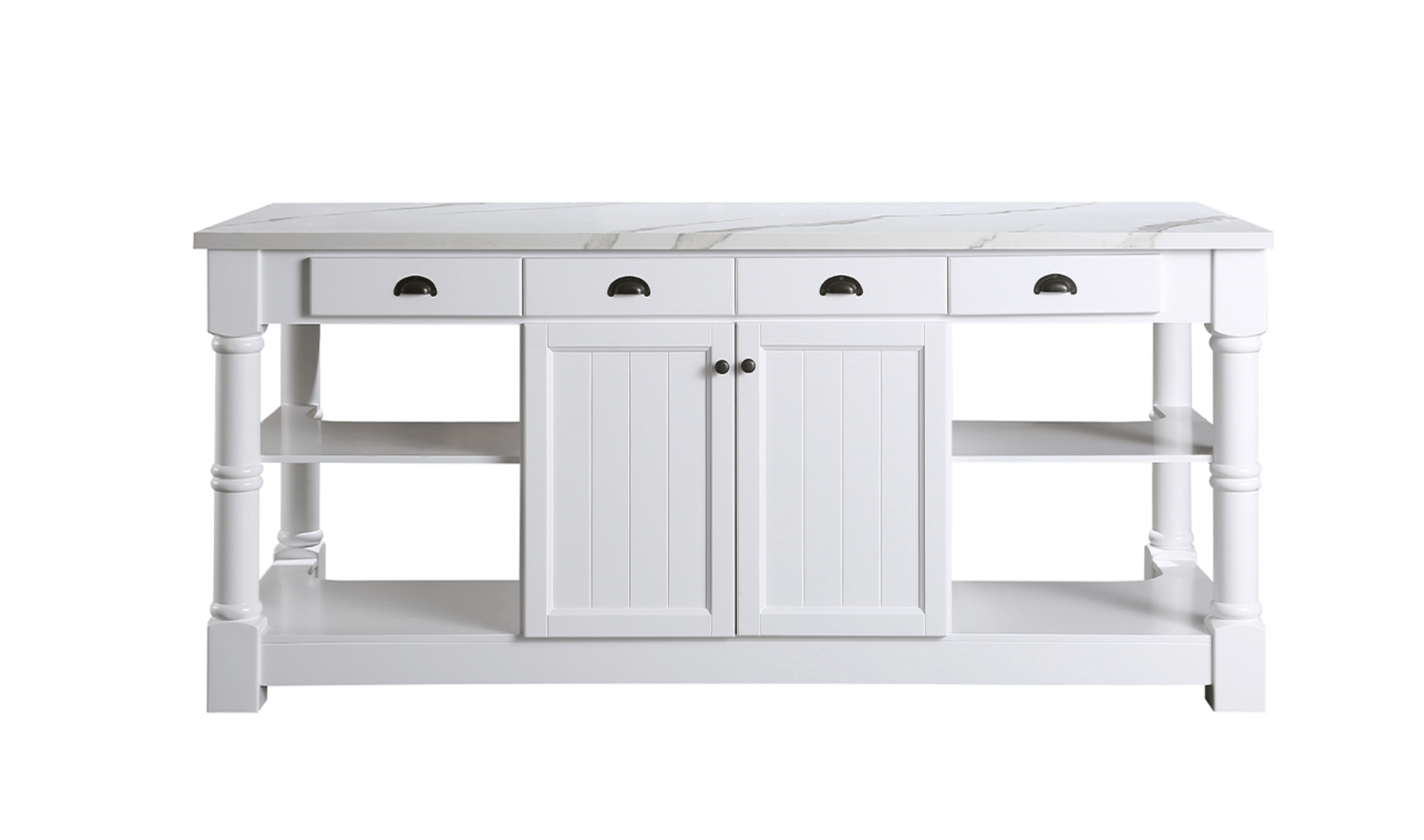 The 80" W x 35.5" H footprint of this island is perfect for medium sized kitchens. 4 spacious drawers, ample shelf space, and white quartz sintered stone countertop make this multi-functional island the perfect centerpiece for your kitchen.